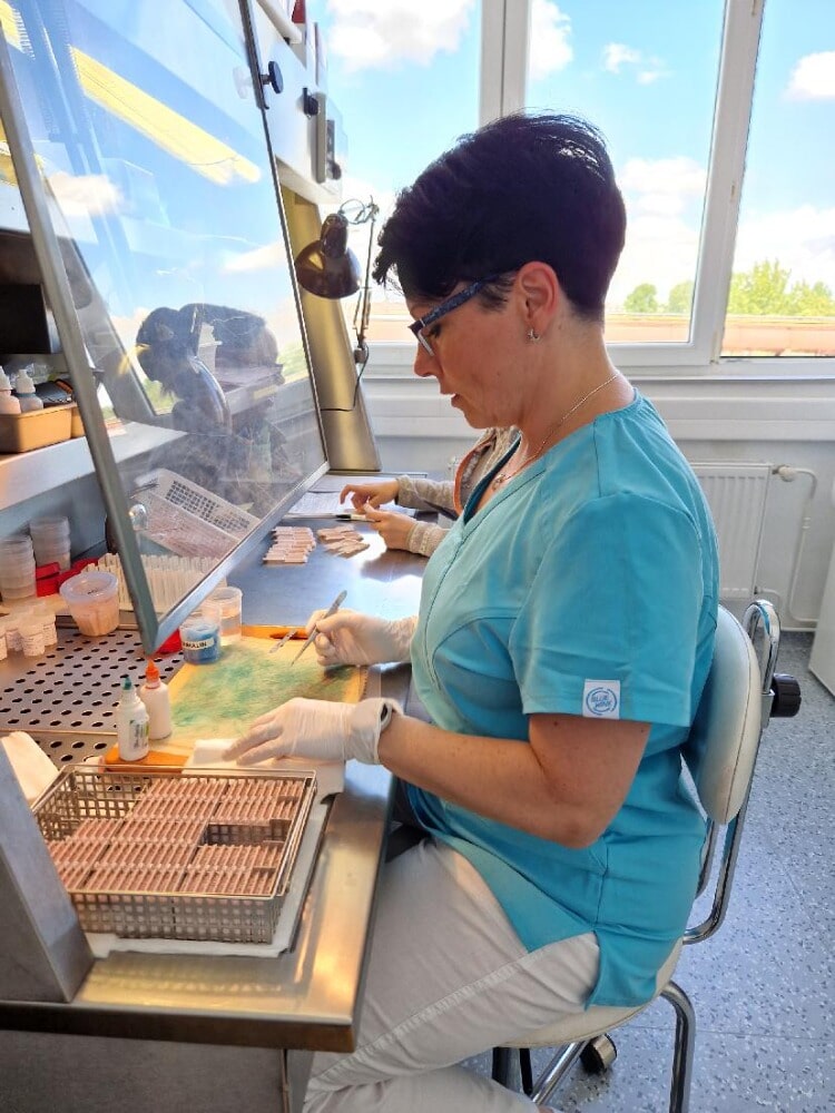 Zpracování vzorků odebraných z živého člověka získaných při operacích, excizních, exstirpacích, endoskopiích, kyretážích, punch biopsiích. Barvení preparátů se provádí základními a speciálními barvicími metodami.